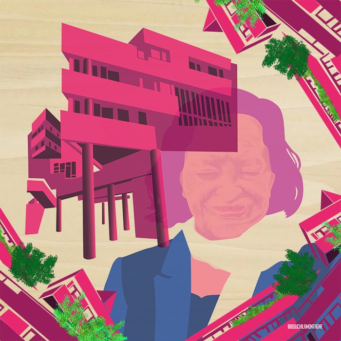 Portrait de l'architecte Renée Gailhoustet qui à conçu l'îlot 8 s'inspirant du courant de l'architecture brutaliste et impression sur bois à la Maison Jaune.article de presse
